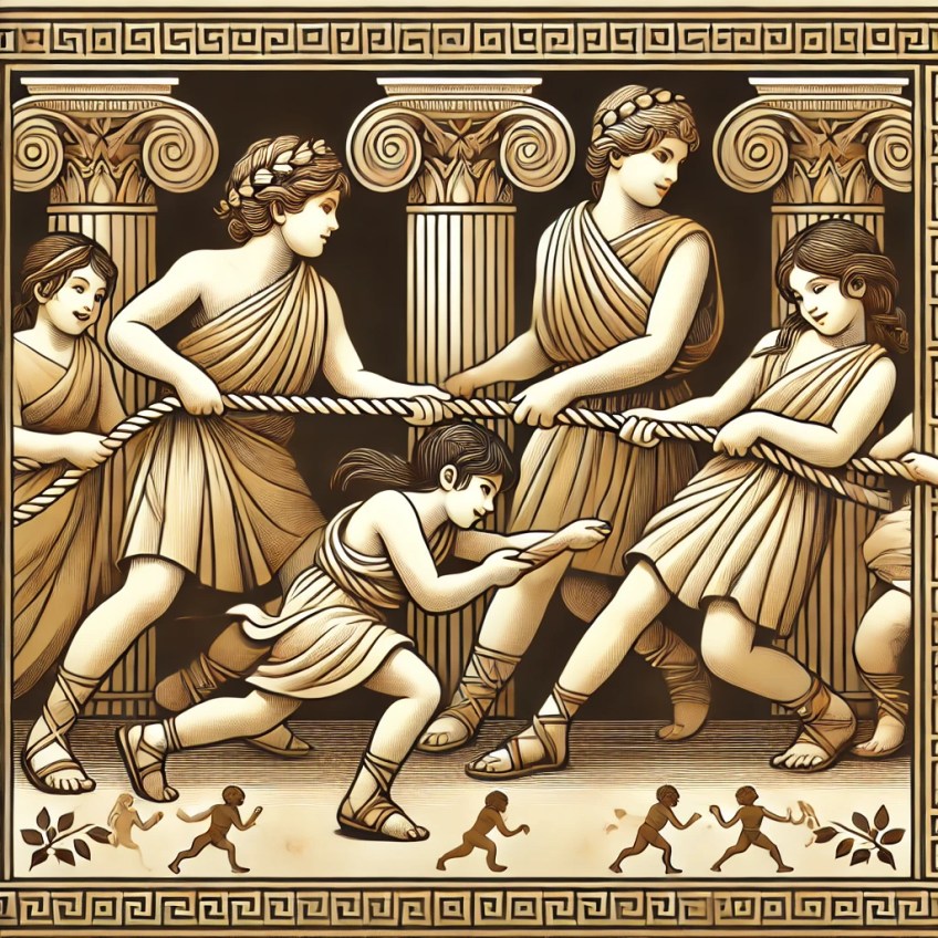 DALL·E 2024-07-01 08.50.40 – In the same elegant style as the Minotaur labyrinth design, create an image of Greek girls and boys holding a rope. The children are dressed in ancien Published July 1, 2024 at 1024 × 1024 in DALL·E 2024-07-01 08.50.40 – In the same elegant style as the Minotaur labyrinth design, create an image of Greek girls and boys holding a rope. The children are dressed in ancien